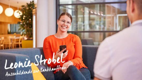 Egal, wo du bei uns startest, erlebst du ein offenes Miteinander, das unsere Zusammenarbeit wertvoller und erfolgreicher macht. Denn im Team macht Arbeiten einfach am meisten Spaß, bestätigt Leonie Strobel, angehende Bankkauffrau mit Zusatzqualifikation Finanzassistentin.