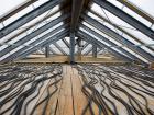 Der Wintergarten am Südende hat eine große Glastürfront. Hier macht man im Sommer Durchzug, um die aufgeheizte Luft aus dem Hauszwischenraum ins Freie strömen zu lassen. Dann wird der Wintergarten als überdachte Terrasse genutzt.
