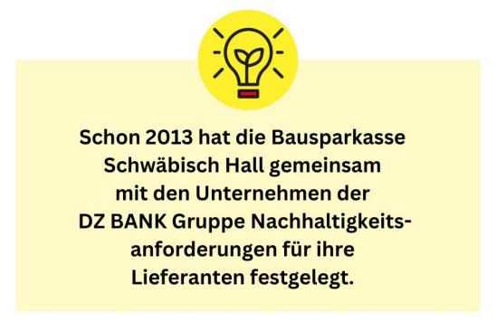 Im Sinne des LkSG haben wir unseren eigenen Geschäftsbereich sowie unsere unmittelbaren Lieferanten einer Risikoanalyse unterzogen. Einer abstrakten Betrachtung nach Länder-, Branchen- und Beschaffungsrisiken folgte die konkrete Analyse. Julian Trittenbach ist erster Ansprechpartner für Nachhaltigkeit im Einkauf im Unternehmen und erklärt: „Schwäbisch Hall arbeitet vorwiegend mit nationalen Lieferanten zusammen und bevorzugt wo immer möglich regionale Anbieter. Wir kennen viele unserer Lieferanten seit Jahren, regelmäßige Gespräche mit ihnen sind fest etabliert – all das hat positiv darauf eingezahlt."